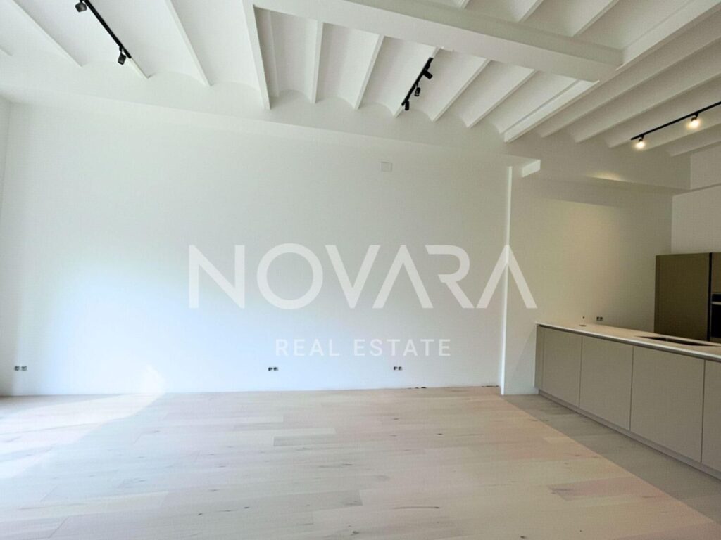 El interior destaca por sus techos de más de 4 metros de altura, que aportan una increíble sensación de espacio. Se distribuye en un gran salón-comedor, cocina independiente de diseño, 3 habitaciones y 3 baños completos. Todas las estancias son amplias y luminosas.