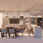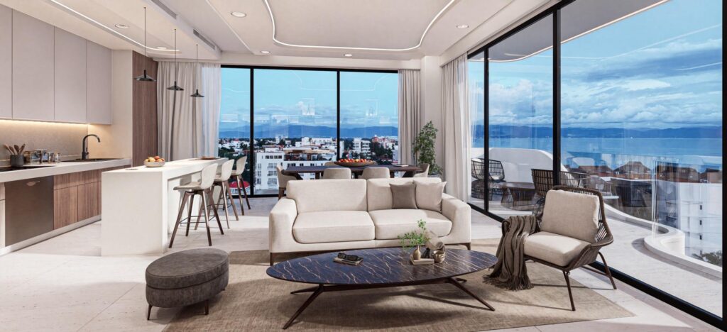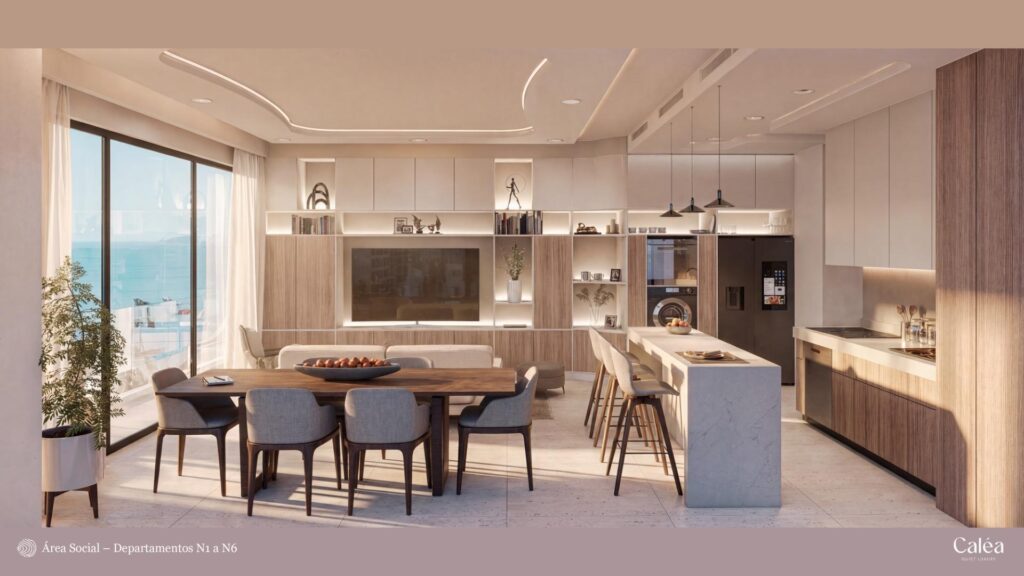 133 m² de sofisticación: Una distribución abierta donde la cocina, el comedor y la sala se integran totalmente con el exterior a través de ventanales de piso a techo.