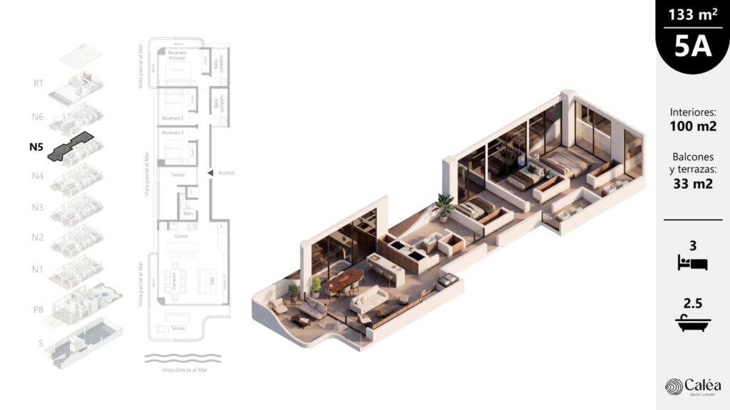 Para el comprador que exige lo máximo en ubicación y amplitud. Esta es una de las propiedades más imponentes de Caléa. Situada en un nivel alto, ofrece una vista frontal y directa al mar desde su impresionante terraza de 33 m², convirtiéndose en el escenario perfecto para los mejores atardeceres de tu vida.