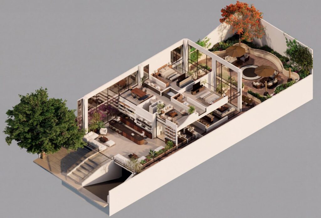 Arquitectura de Impacto: Diseño en dos niveles con doble altura en el área social, creando un espacio de lujo que destaca en plataformas de renta como Airbnb o Rentas de Lujo.